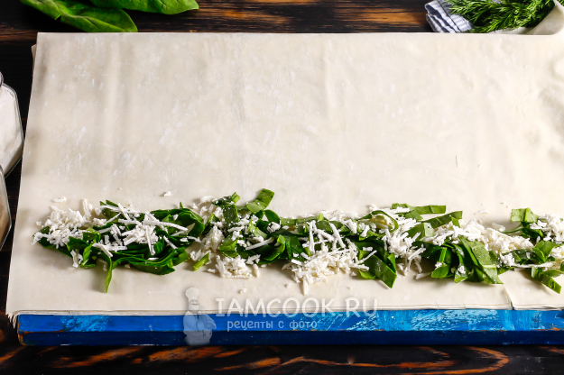 Разложите пласты теста на доске или рабочей поверхности. Выложите часть шпинатной нарезки и натертой брынзы на широкий край теста.