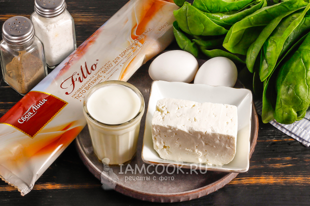 Подготовьте необходимые ингредиенты для создания баницы со шпинатом и брынзой с золотистой корочкой.