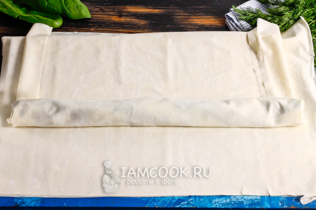 Я заворачивала начинку в два слоя теста, потому что оно очень тонкое. Вы можете использовать один слой. Заверните узкие края внутрь, чтобы начинка не вывалилась при выпекании, и скатайте рулетом.