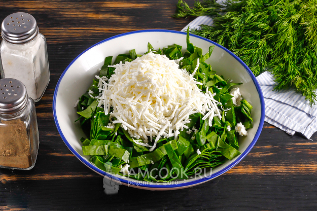 Брынзу натрите в емкость на терке с мелкими ячейками. Обязательно попробуйте ее на вкус. Если она соленая, то соль добавьте только в заливку. Если не очень соленая, то всыпьте щепотку соли в емкость на шпинат.