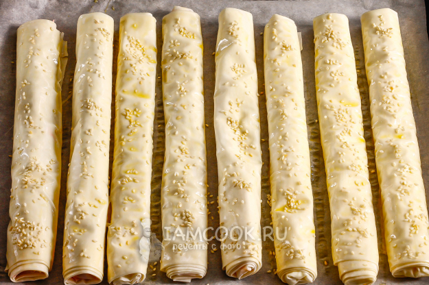 Разогрейте духовку до 180 градусов. Застелите противень пергаментной бумагой и выложите на него трубочки. Взбейте куриное яйцо и смажьте заготовки яичной массой с помощью кулинарной кисти. Присыпьте сверху кунжутными зернами любого цвета. Поместите противень в духовку на 15-20 минут.