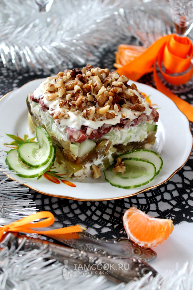 Заливаем фасоль заправкой и украшаем крупно нарезанными орехами. Отправляем салат на 1-2 часа в холодильник, а при подаче снимаем кольца.