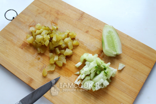 Добавляем соленые или маринованные огурчики, они и так сочные, я заправку не стала добавлять.