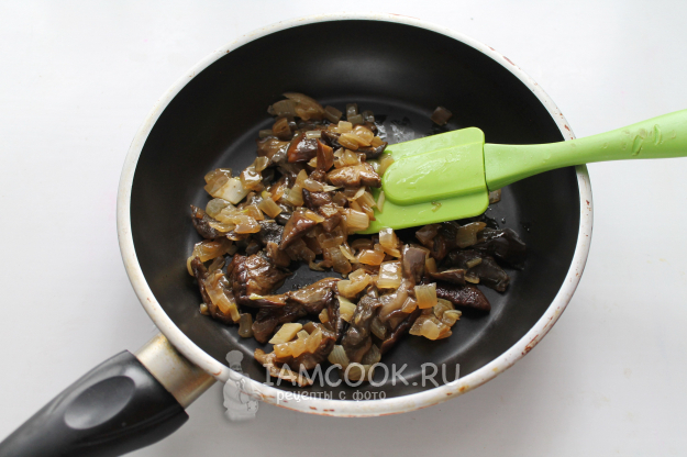 Лесные грибы я использовала предварительно обжаренные и замороженные, оставалось их просто смешать с обжаренным на сковороде с маслом луком и чуть пожарить вместе. Если у вас свежие или отваренные грибы, то их нужно поджарить вместе с луком и охладить.