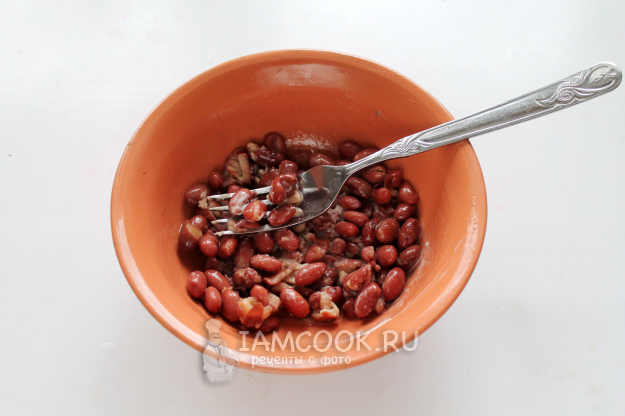 Теперь нужно ее слегка потолочь, в пюре превращать не нужно, слегка фактуру сохраняем. Просто нужно, чтобы фасоль не разделялась на отдельные зерна, а имела способность сохранять слой.