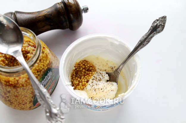 Затем сразу готовим заправку, т.к. она нужна на всех этапах приготовления салата. Для этого соединяем сметану и майонез, добавляем горчицу - я люблю зерновую, но можно взять обычную (количество регулируйте в зависимости от ее остроты), для аромата чуть приперчим. Хорошо перемешаем смесь до однородности, вот и все - заправка готова.