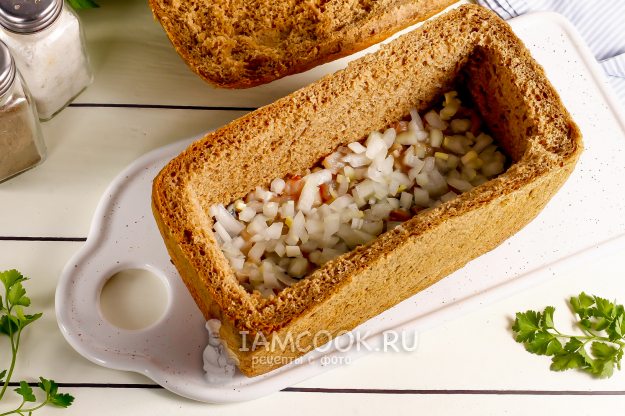 Слейте маринад с луковой нарезки и выложите ее на рыбную в хлебе.