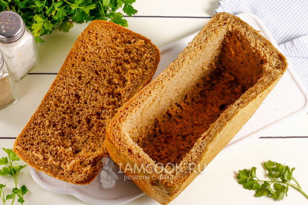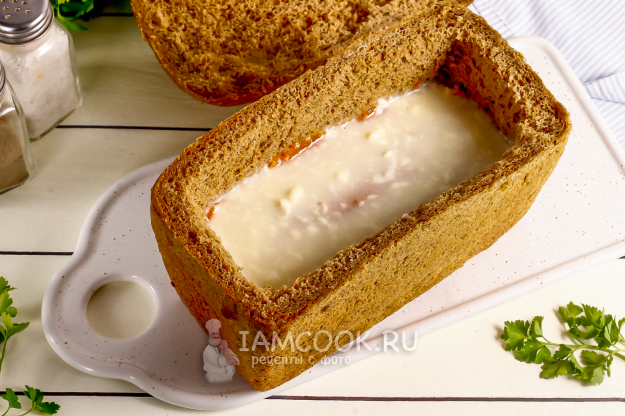 Аккуратно срежьте верхушку с булки хлеба выбранного вами сорта. Можно приобрести и белый хлеб, если другого нет в наличии. Подрежьте по бокам мякиш и выберите его руками, получая сундучок из хлеба или шкатулку - как вам больше нравится))))