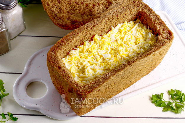 Очистите куриные яйца от скорлупы, промойте и натрите на терке с мелкими ячейками. Это нужно делать быстро, чтобы майонезный соус с желатином не застыл. Присолите яичную нарезку и выложите в хлеб. Влейте пару ложек соуса.