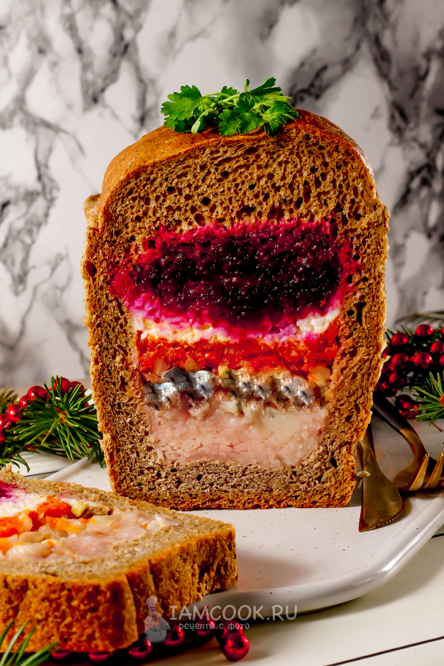 Спустя указанное время разверните кирпичик и аккуратно нарежьте ломтиками толщиной не менее 1-1,5 см, иначе вывалятся из них слои. К столу «Селедку под шубой» в хлебе подавайте охлажденной.