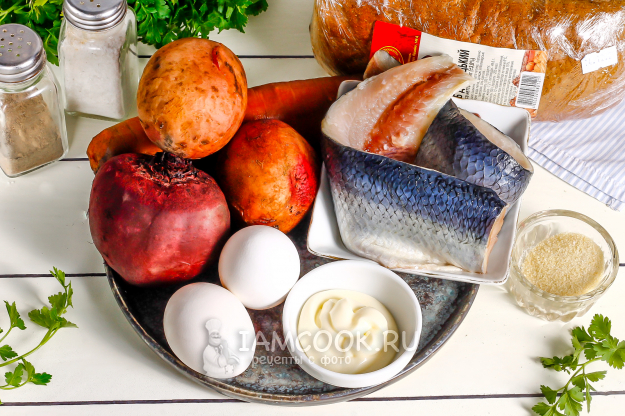 Возьмите необходимые ингредиенты для приготовления «Селедки под шубой» в хлебе. Заранее отварите свеклу, морковь и картофель примерно 40-50 минут и остудите. Куриные яйца отварите отдельно в течение 15 минут и остудите.