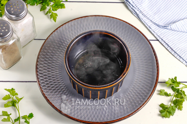 Желатин всыпьте в пиалу и залейте 60 мл кипятка, аккуратно перемешайте и также оставьте на 10 минут для набухания.