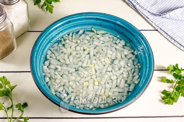 Репчатый лук очистите в воде, промойте. Нарежьте мелкими кубиками и залейте 100 мл кипятка, чтобы он отдал свою горечь. Влейте уксус и оставьте на 10 минут.