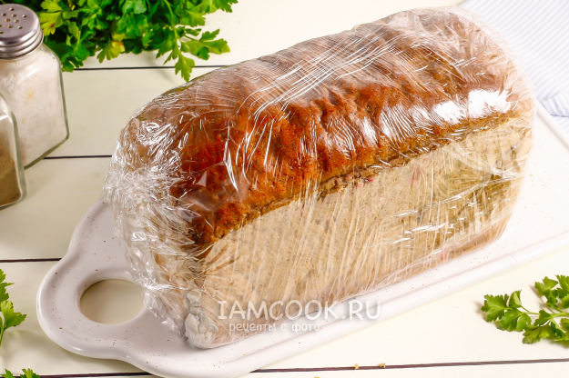 Накройте срезанной верхушкой кирпичика и обмотайте пищевой пленкой либо фольгой. Поместите собранную заготовку в морозилку на 30-40 минут. Почему я рекомендую ее - потому что в холодильнике закуска будет охлаждаться дольше и хлебные бока могут впитать в себя соус, размягчиться. А заодно и свекольный сок прокрасит почти все слои. Поэтому в морозилке желатин быстрее схватится и слои застынут. Главное, не забудьте там закуску, чтобы она не заледенела!