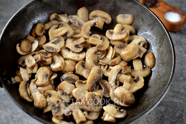 Мясо снимите на тарелку, а в это же масло положите нарезанные пластинками грибы. Их тоже на сильном огне обжарьте несколько минут, нужно дать жидкости испариться.
