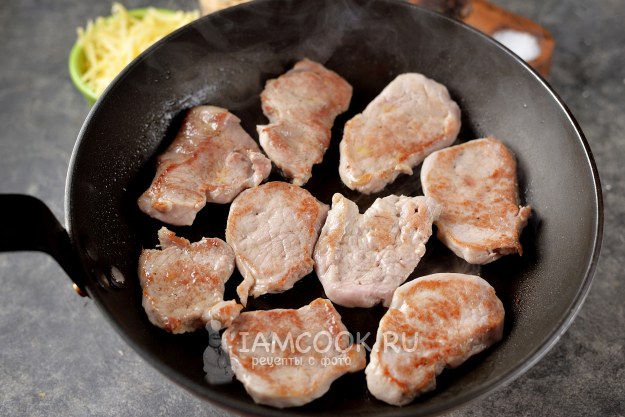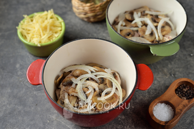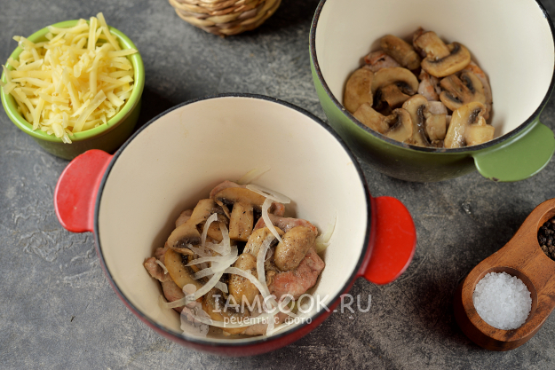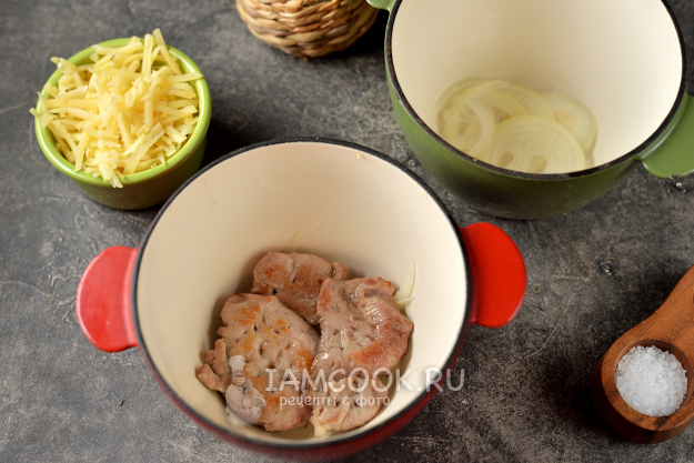 На дно горшочков положите немного тонко нарезанного лука, сверху положите несколько ломтиков обжаренной свинины.