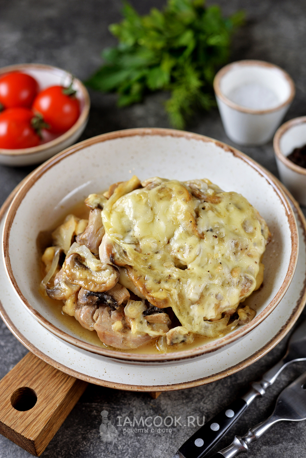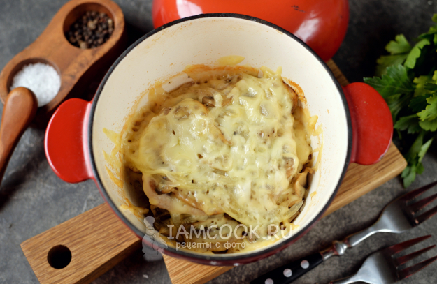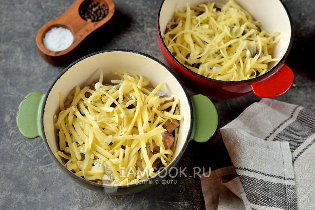 Последний слой при желании можно слегка смазать майонезом, а потом щедро посыпать натертым твердым сыром. Накройте горшочки крышками и отправьте в предварительно разогретую до 190 градусов духовку в режиме верхнего и нижнего нагрева на 40 минут.