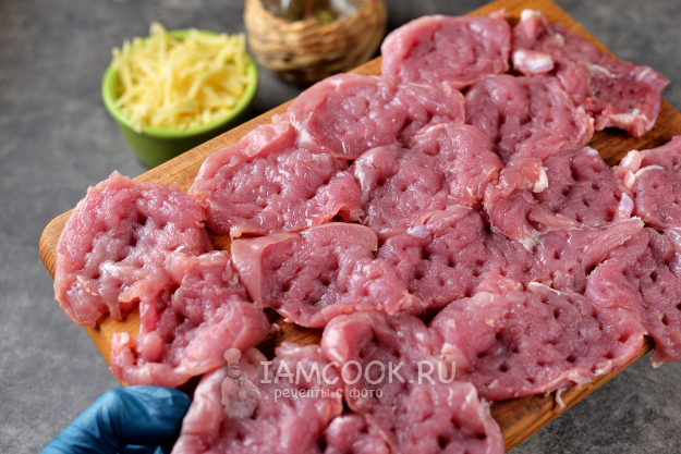 Срежьте на вырезке все пленки и жилы, нарежьте ее поперек волокон ломтиками толщиной в 1 сантиметр, положите на разделочную доску, слегка отбейте специальным молотком.