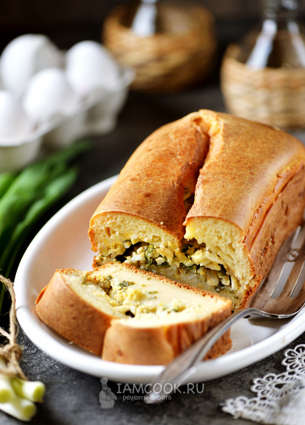 Закусочный заливной пирог на кефире с яйцом и зеленым луком готов. Нарежьте на порции и подавайте в качестве перекуса или на завтрак со сладким чаем.