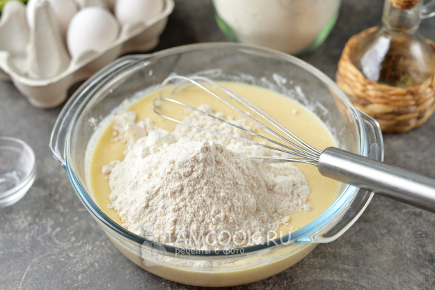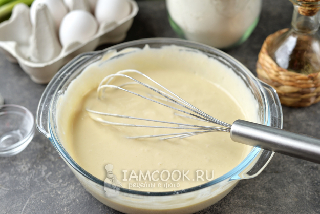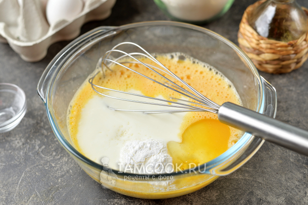 Оставшиеся два яйца взбейте в глубокой емкости до однородности венчиком.
