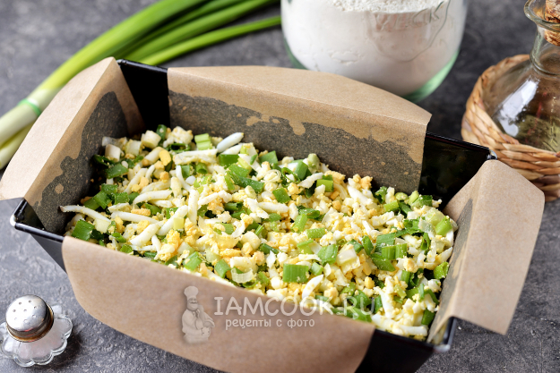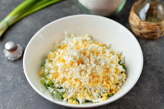 Порубите зеленый лук, натрите на крупной терке вареные яйца, переложите в глубокую миску, добавьте соль и перец по вкусу, тщательно перемешайте начинку.