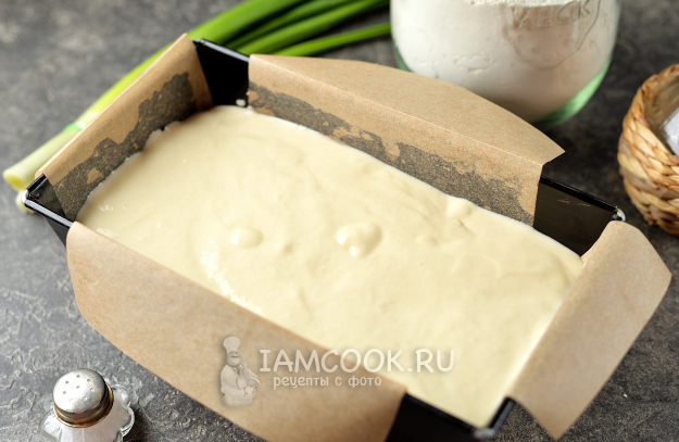 Подготовьте небольшую огнеупорную форму, смажьте ее растительным маслом, выстелите пекарской бумагой. Вылейте в нее половину теста, выложите начинку.