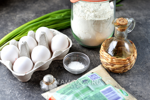 Возьмите все необходимые продукты для приготовления заливного пирога на кефире с яйцом. Три яйца заранее отварите и остудите в холодной воде, помойте и обсушите зеленый лук.