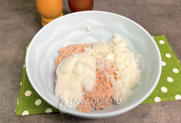 Выложите в фарш рис и взбитые белки, аккуратно перемешайте.