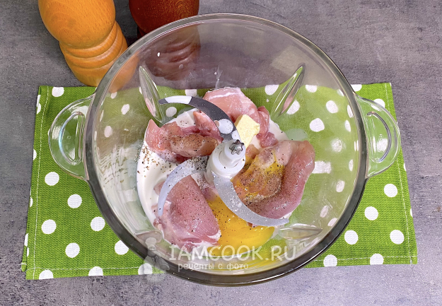 Далее промойте мясо, нарежьте на небольшие кусочки и сложите в чашу блендера. Добавьте сливки и сливочное масло. Затем отделите желток от белка и выложите желток в чашу. Посолите, поперчите по вкусу. Взбейте всё в фарш.