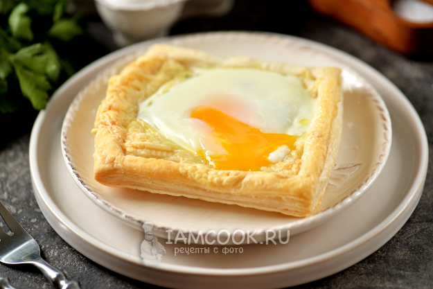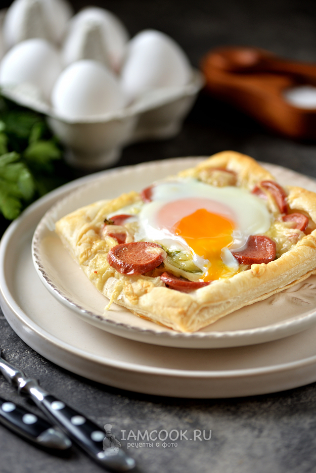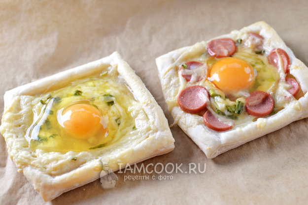 Вот и все! Слойки с яйцом и сыром (из слоеного теста) готовы к подаче на стол! Проколите желток и сразу же подавайте.