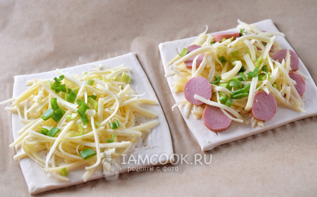 Посыпьте тесто нарезанным зеленым луком и натертым твердым сыром. Одну заготовку я решила попробовать сделать с сосиской. Отправьте противень в предварительно разогретую до 190 градусов духовку на 10 минут в режиме верх-низ.