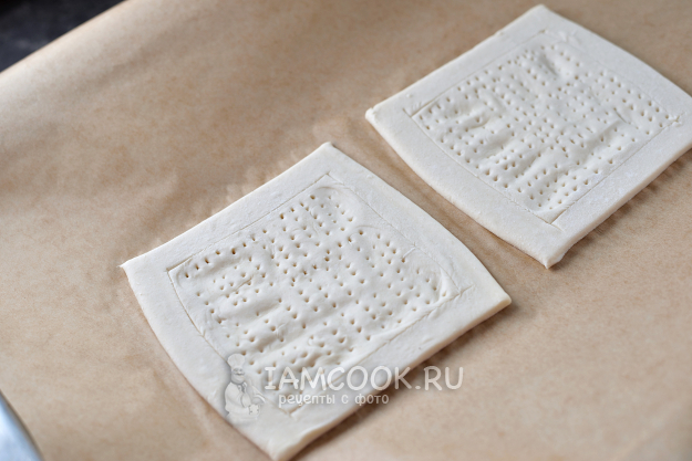 Отрежьте от теста кусок, разрежьте его пополам, раскатывать не нужно. Острым ножом сделайте надрезы по периметру, внутри прижмите тесто тыльной стороной ложки и наколите зубцами вилки, чтобы серединка не вздулась во время выпечки.