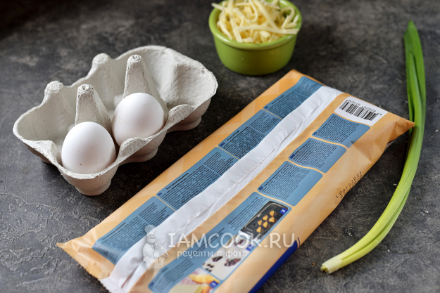 Возьмите все необходимое для приготовления слоек с сыром и яйцом.