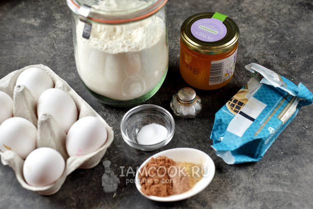 Подготовьте все необходимые продукты для новогодних имбирных пряников «Снеговики». Масло, мед и яйца должны быть комнатной температуры.