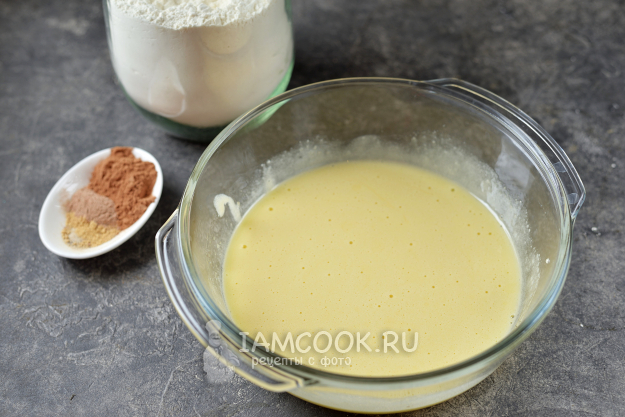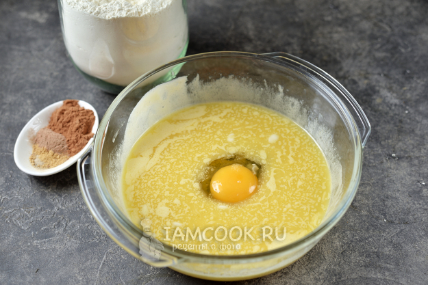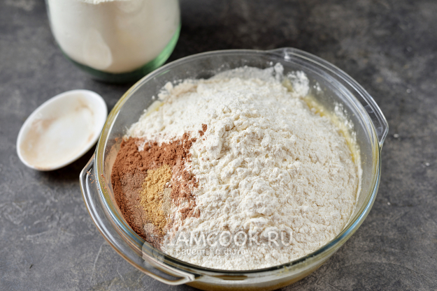 Всыпьте специи и какао, добавьте щепоть соли и муку.