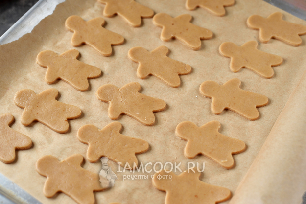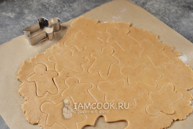Чуть присыпьте пергамент мукой, раскатайте тесто толщиной 0,3-0,4 сантиметра, сделайте вырубкой для печенья в виде человечков заготовки.