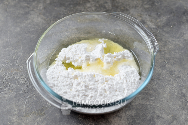 В глубокую миску всыпьте сахарную пудру, добавьте яичные белки, лимонный сок и щепоть соли.