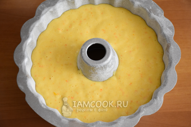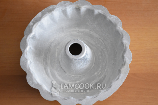Форму для кекса смазать сливочным маслом и присыпать мукой. Излишки муки стряхнуть. Я использую круглую форму диаметром 22 см с отверстием.