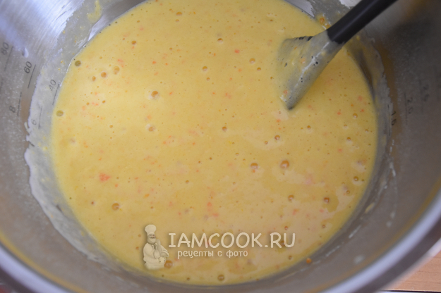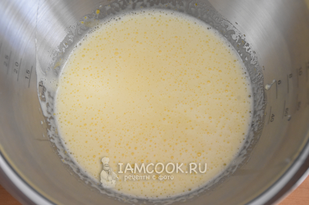 В чаше миксера соединить яйца и сахар. Взбить до получения пышной светлой массы.