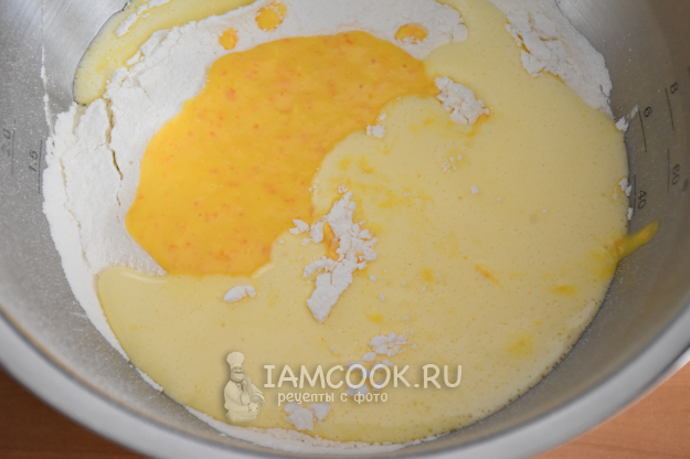 Отдельно соединить муку, крахмал, разрыхлитель, щепотку соли и просеять в яичную массу.