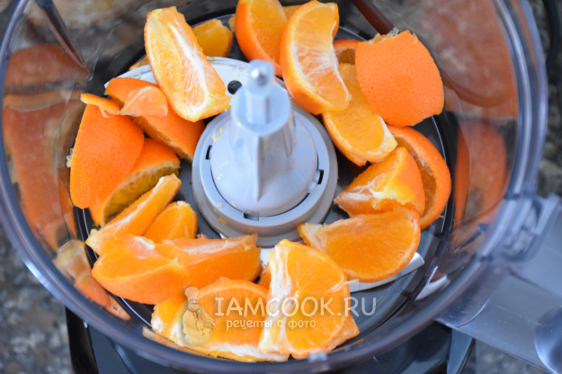 Мандарины помыть, нарезать на четвертинки и выложить в блендер.