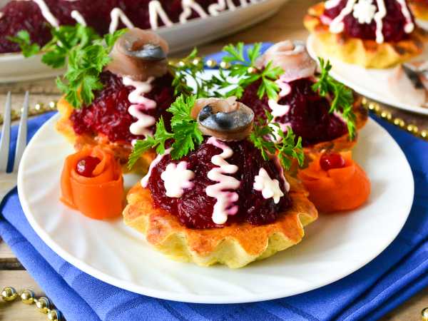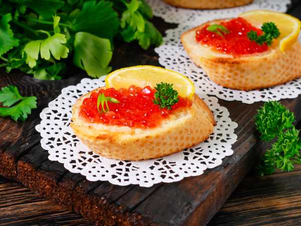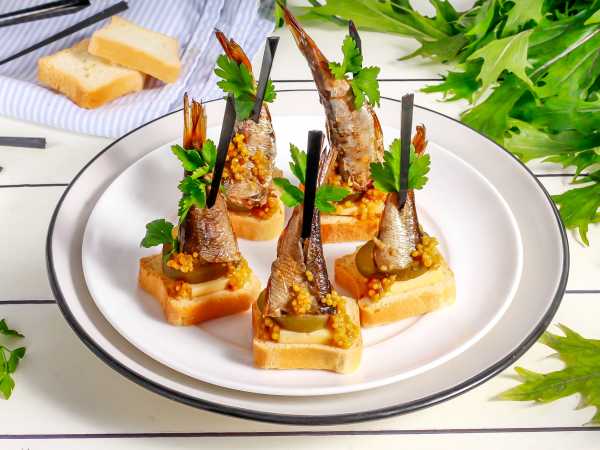 Украсьте канапе со шпротами зерновой горчицей и листочками петрушки, сразу же подайте к столу.