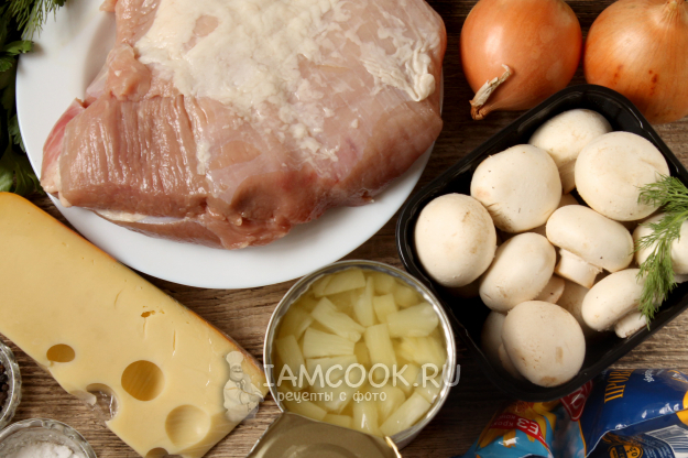 Для приготовления мяса по-французски с ананасом и грибами возьмите необходимые продукты. Если нужно, мясо предварительно разморозьте.