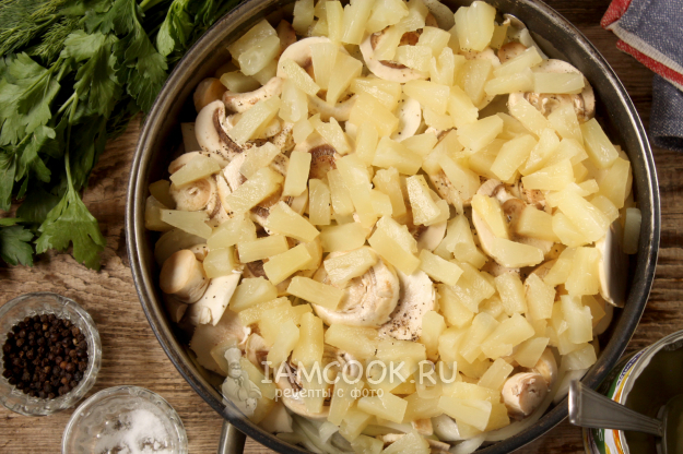 По грибам разбросайте кусочки консервированного ананаса (компот слейте).