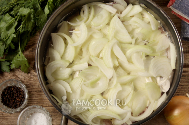 Накройте луковым слоем. Шинкуйте репчатый лук тонко, но его должно быть много.