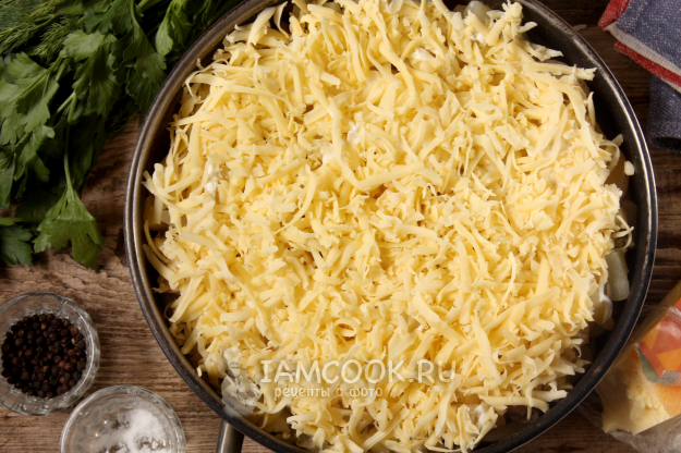 Затем разложите кружками или другим способом нашинкованные шампиньоны. Приправьте специями.