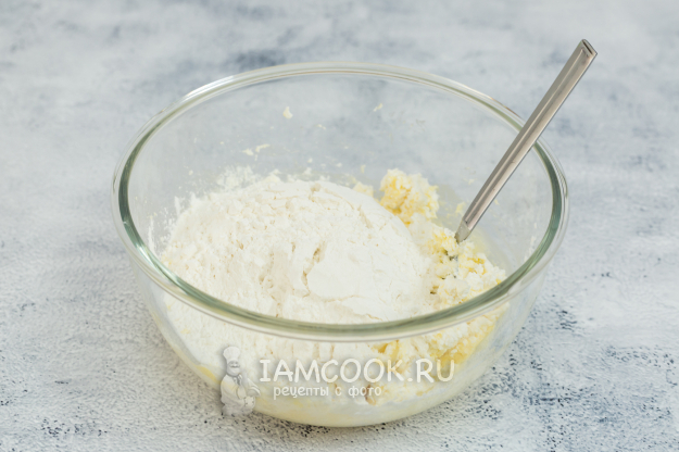 Добавьте муку, смешанную с разрыхлителем, ванилином и солью.