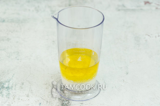 Ногу погружного блендера поставьте в стакан, и, не отрывая его ото дна, доведите смесь до густого состояния.