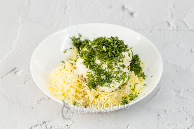 Добавьте майонез, натёртый на мелкой тёрке чеснок и нарезанный укроп.