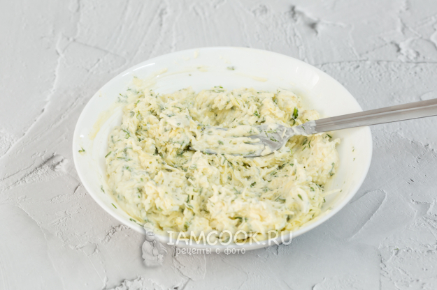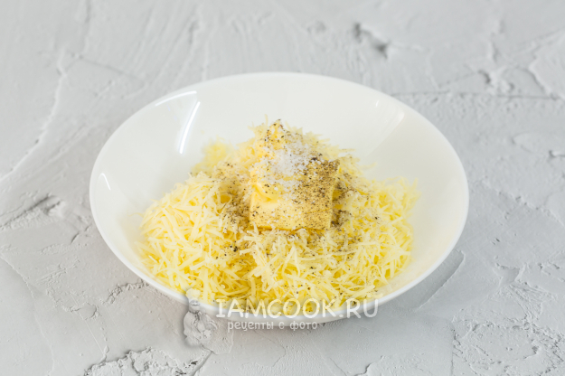 Сыр натрите на мелкой тёрке. Добавьте сливочное масло, соль и перец.